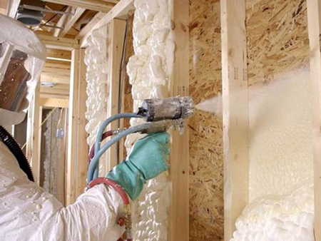 Особую популярность приобрел метод напыления пенополистирольного состава на внутренние и наружные конструкции домов. Во время проведения напыления жидкие компоненты полиол и полиизоцианат смешиваются без доступа воздуха, и под высоким давлением через шланги подаются на распылительный пистолет. Вспененный раствор надежно сцепляется практически с любой поверхностью как в горизонтальной, так и в вертикальной плоскости. Пена активно увеличивается в объеме и схватывается в продолжение короткого времени. Это дает мастеру возможность регулировать толщину наносимого слоя.