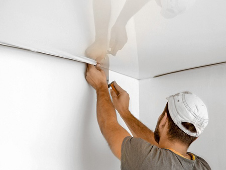 Ведь полотно натяжного потолка отличается тем, что не является стойким к воздействию органических растворителей. И, конечно, на потолке не должны образовываться складки. Кроме того, на его поверхности не должно оставаться следов от пальцев или царапин от шпателя. Ведь именно шпатель и используют для того, чтобы заправить полотнище в багет.