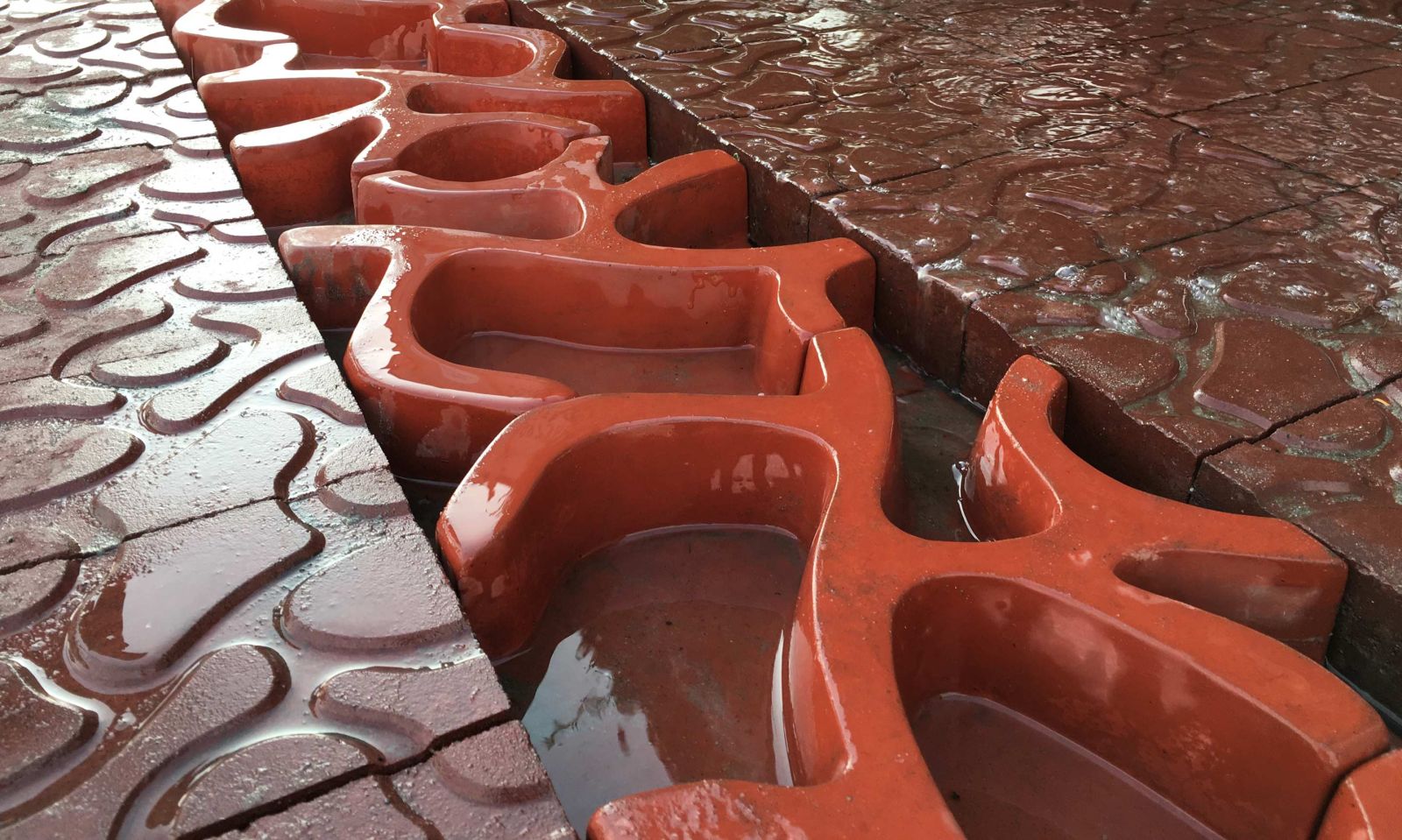 Плитка работает, создавая проницаемую поверхность, похожую на земную кору. Небольшие отверстия в плитке позволяют воде просачиваться под землю и поступать в искусственные водоносные горизонты. Вода может оставаться в хранилище для последующего использования или направляться для полива растущих недалеко газонов и деревьев.